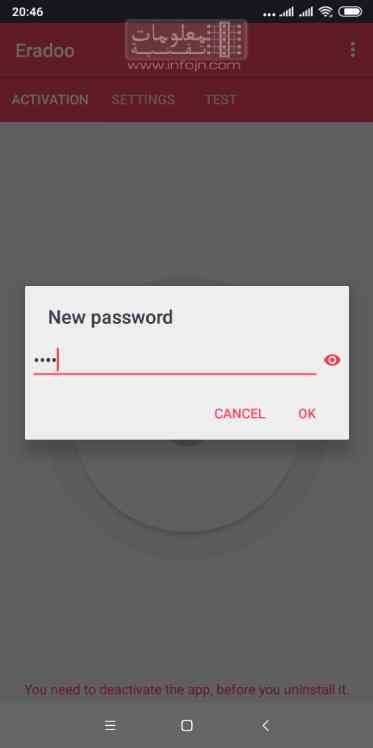 اضغط مرة أخرى على زر التشغيل الكبير لكي يطلب منك إدخال كلمة السر الخاصة بك لاستعمالها دائماً أثناء الدخول للتطبيق, عند تنشيط التطبيق يظهر رمز التشغيل بالأحمر.
