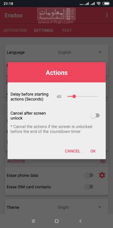 تحتوي خيارات قسم Action على رمز ترس بالجانب مما يعني أنه يمكنك تهيئتها بشكل أفضل ومناسب لك, على سبيل المثال تحديد المدة التي يجب أن ينتظرها التطبيق لمسح البيانات بشكل تلقائي بعد حظر بطاقة Sim أو إزالتها أو استبدالها, هذه ميزة مهمة تساعد في حالة نسيانك التطبيق وتم إزالة شريحة Sim من السارق, أضف على ذلك أنه يمكنك أيظاً تحديد الوقت لمسح البيانات بعد إلغاء قفل شاشة الهاتف.