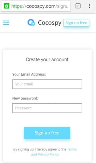 1- افتح المتصفح على اي جهاز وادخل إلى الموقع الرسمي لـ Cocospy, ثم قم بالاشتراك للحصول على حساب على الموقع.